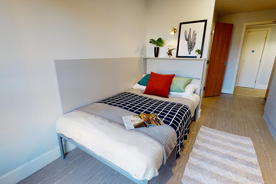 Se trata de una residencia moderna que dispone de estudios privados, cada uno con cama doble con espacio de almacenamiento inferior, escritorio y baño privado. La cocina está totalmente equipada con fogones, horno, nevera y congelador, ideal para una estancia independiente.